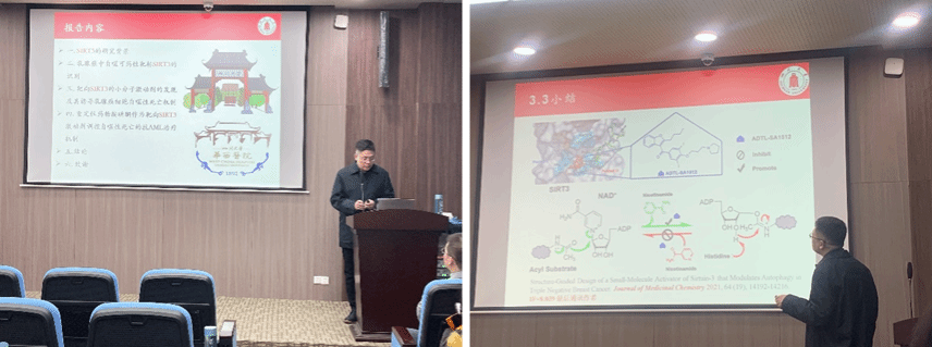 刘博研究员,2020年至今入选Elsevier中国高被引学者(药学)、全球顶尖前10万科学家排名(2020年-至今)、全球前2%顶尖科学家榜单(2023年)。刘老师的研究方向主要是基于细胞自噬创新性靶标候选药物发现与作用机制的研究。本次刘老师带来的题为《SIRT3与肿瘤治疗——从可药性自噬靶标识别到成药性小分子激动剂发现》的报告从:SIRT3与小分子调节剂的研究背景、乳腺癌中自噬可药性靶标SIRT3的识别、靶向SIRT3的小分子激动剂的发现及其诱导乳腺癌细胞自噬性死亡机制以及重定位药物胺碘酮作为靶向SIRT3激动剂调控自噬性死亡的抗AML治疗机制研究四部分工作为我们展示了其团队近年来取得的丰硕的阶段性成果。