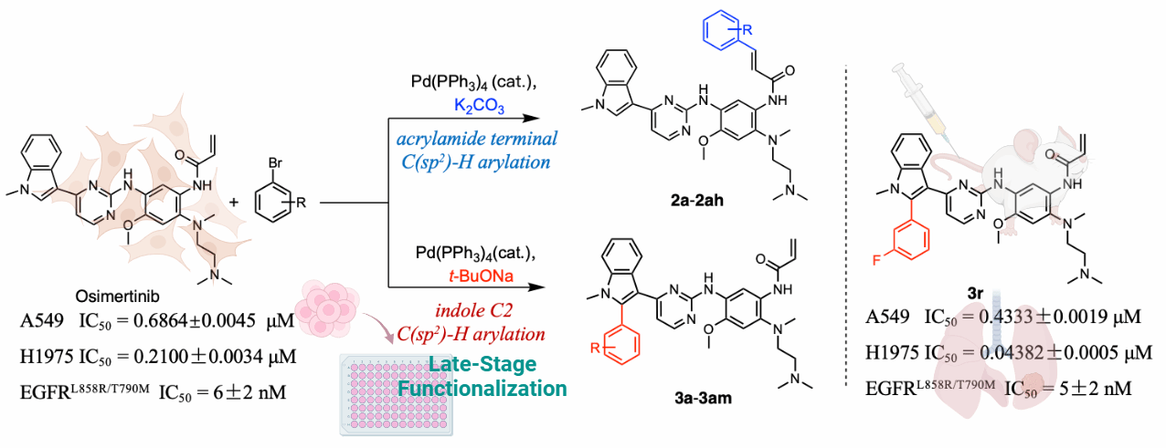 化学合成是药物研发的限速步骤。在传统的药物化学研究中,药物分子的结构修饰往往需要经数步反应“从头合成”,步骤繁琐,耗时长,花费高。近年提出的新概念“末期官能团化”(Late-Stage Functionalization, LSF),采用金属催化C-H活化/光催化手段,直接对结构复杂的药物或活性天然产物进行结构改造,只经一步反应即可获得大量同系列衍生物,可快速高效为生物活性及构效关系研究提供化合物库。然而,对于这些复杂分子而言,其结构里可能存在数个可C-H活化位点,导致反应选择性差、无针对性。对此,高峰教授团队针对治疗非小细胞肺癌(non-small cell lung cancer, NSCLC)的临床一线小分子药物,第三代表皮生长因子受体酪氨酸激酶抑制剂(epidermal growth factor receptor-tyrosine kinase inhibiter, EGFR-TKI)奥希替尼(Osimertinib),开发了一种钯催化下仅需改变碱即可实现Osimertinib复杂分子内区域选择性直接芳基化的方法学,且将该方法用于Osimertinib的末期直接选择性芳基化修饰,获得大量衍生物,并在其中发现抗非小细胞肺癌活性优异的先导化合物(图1)。
