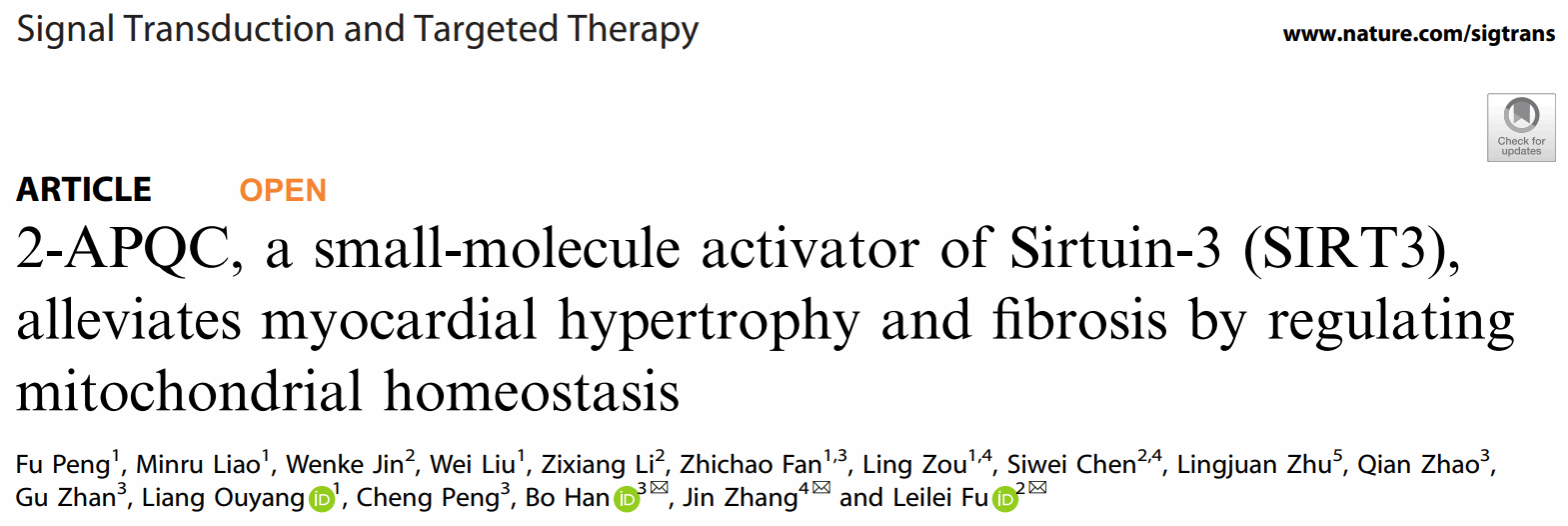 符雷蕾课题组联合四川大学药学院彭芙课题组与深圳大学药学院张瑾课题组及成都中医药大学药学院的合作者们在Signal Transduction and Targeted Therapy (中科院一区Top期刊,影响因子:39.3) 上共同发表了题目为“2-APQC, a small-molecule activator of Sirtuin-3 (SIRT3), alleviates myocardial hypertrophy and fibrosis by regulating mitochondrial homeostasis”的研究性论文,论文的最后通讯作者为爱迪影视