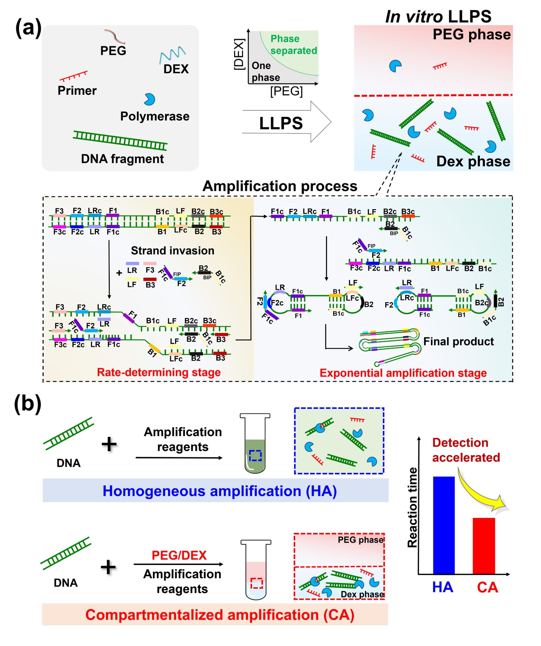 文章亮点:①首次报道了在LLPS中进行高度有序的顺序反应;②LLPS对复杂反应的加速并不是连续的,而是取决于每个特定反应阶段的动力学和反应物浓度;③LLPS作为创新性的加速诊断工具,将反应时间显著缩短了27分钟;④基于LLPS的诊断工具可对目标核酸进行定量分析,灵敏度高达 10 copies/μL。