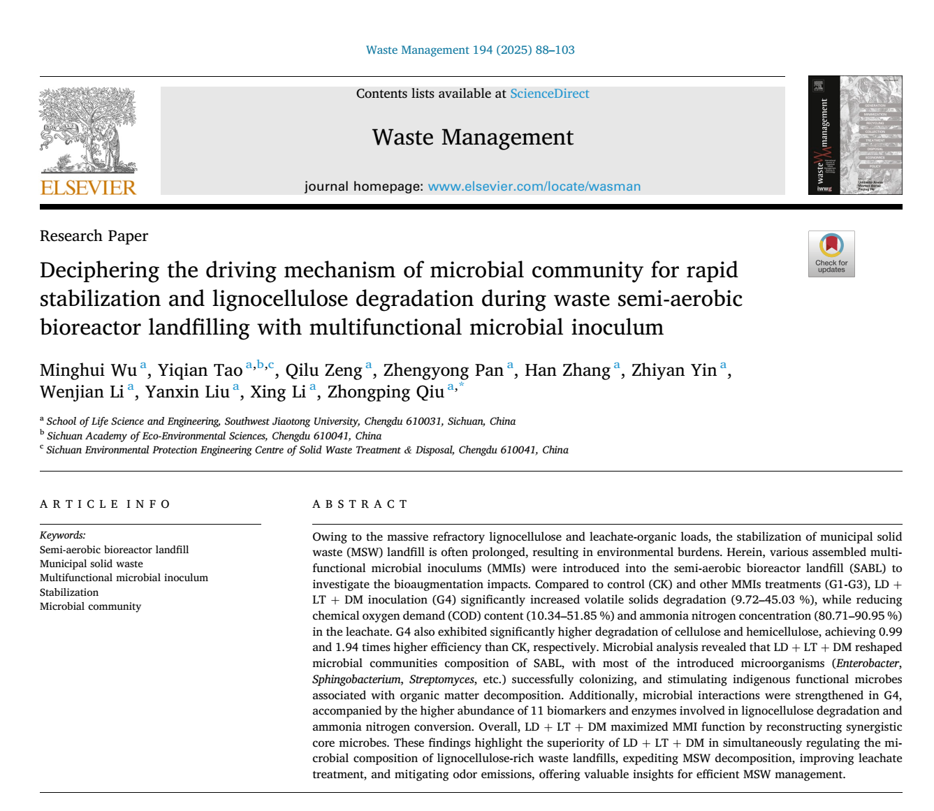 “资源微生物技术”邱忠平教授团队的研究成果“Deciphering the driving mechanism of microbial community for rapid stabilization and lignocellulose degradation during waste semi-aerobic bioreactor landfilling with multifunctional microbial inoculum”。论文通讯作者为邱忠平教授,第一作者为吴明蔧老师,爱迪影视