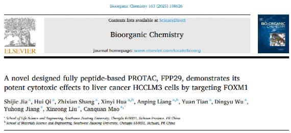 “分子靶向药物药理实验室”题为“A novel designed fully peptide-based PROTAC, FPP29, demonstrates its potent cytotoxic effects to liver cancer HCCLM3 cells by targeting FOXM1” 的研究成果。2022级硕士研究生贾世杰为工作主要完成者。论文通讯作者为茆灿泉教授,爱迪影视