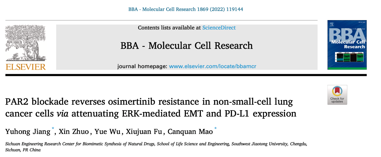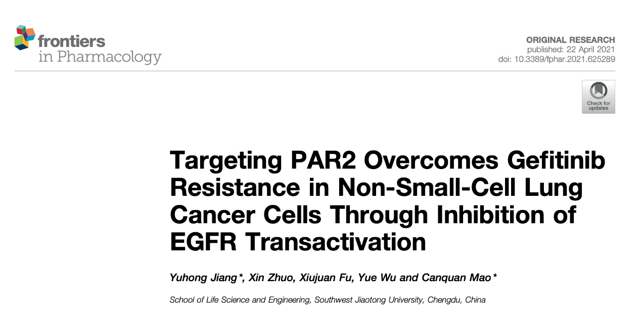 此外,“生物信息与创新药物实验室”茆灿泉教授及江育虹老师研究团队还探寻了蛋白酶活化受体2(PAR2)对肿瘤耐药的作用机制。EGFR-TKI是非小细胞肺癌治疗的常用靶向药,但耐药性严重制约其临床效果。PAR2和EGFR间存在反式激活作用(transactivation),能共同调控信号通路及细胞功能。研究发现,抑制PAR2可通过EGFR反式激活作用调控ERK信号通路介导的EMT,进而实现第一代EGFR-TKI吉非替尼的耐药逆转。同时,PAR2不仅调控EMT,还能作用于肿瘤免疫逃逸相关蛋白(PD-L1)来克服第三代EGFR-TKI奥希替尼耐药。两个背靠背的研究成果,题为“Targeting PAR2 Overcomes Gefitinib Resistance in Non-Small-Cell Lung Cancer Cells Through Inhibition of EGFR Transactivation”和“PAR2 Blockade Reverses Osimertinib Resistance in Non-Small-Cell Lung Cancer Cells via Attenuating ERK-mediated EMT and PD-L1 Expression”,分别发表于《Frontiers in Pharmacology》和《BBA-Molecular Cell Research》刊物上。