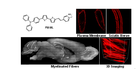 髓鞘是包围和隔离神经轴突的结构,是中枢神经系统的重要组成部分。对脑组织中髓鞘纤维进行可视化研究在很大程度上有助于髓鞘相关疾病的诊断和大脑功能的理解。而目前应用最广泛的髓鞘可视化荧光探针,如Vybrant DiD和FluoroMyelin,其背景荧光干扰大、对比度低和组织渗透性差,这些缺点极大地限制了其在三维成像和髓鞘示踪中的应用。在上述研究的基础上,该项目组基于髓鞘多层质膜的结构特性,通过两亲性的策略成功开发了一种具有AIE性质的近红外荧光探针PM-ML,探针分子在与髓鞘多层质膜结合后能够实现荧光信号点亮并放大的特性显著提高其信噪比,用于高性能髓鞘成像。PM-ML具有髓鞘质膜靶向特性,同时具有良好的光稳定性,能特异性标记出游离坐骨神经和小鼠脑组织中的有髓纤维,可用于髓鞘、髓鞘纤维和束状细胞的三维可视化,具有较高的穿透深度。PM-ML染色与几种组织清理方法兼容,同时在神经病理学研究中评估髓鞘形成的应用也在多发性硬化症小鼠模型中得到证实。该项目成功构建了高空间分辨率的有髓纤维三维荧光成像探针,极大地促进了对三维神经网络和脱髓鞘疾病病理生理学的理解,对髓鞘相关疾病的研究作出巨大的贡献。该成果以“A near-infrared AIE flfluorescent probe for myelin imaging: From sciatic nerve to the optically cleared brain tissue in 3D”为题发表于综合类国际顶级期刊PNAS上《Proc. Natl. Acad. Sci. USA, 2021, 118, e2106143118》IF11.205。全文链接://www.pnas.org/doi/10.1073/pnas.2106143118
