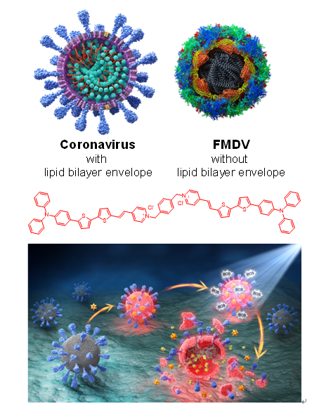 人类冠状病毒(包括COVID-19)是一种包膜病毒,其衣壳和遗传物质覆盖着脂质双分子层,可对宿主细胞外的病毒提供额外保护。由于病毒表面蛋白在不同的人类冠状病毒种类和突变体之间存在差异,而病毒的共有成分双分子脂膜可能是人类冠状病毒通用的靶点。基于此,在熟练应用PM靶向策略以及荧光探针设计理论和实践经验的基础上,项目组成功设计并合成了一种膜靶向AIE近红外光敏剂DTTPB,其可以特异性地靶向人类冠状病毒的脂质双分子层,实现靶向光动力灭活。DTTPB具有覆盖整个可见光范围的宽吸收带和较高的摩尔吸收系数以及高的ROS产率,可用于病毒的高效灭活,有效抑制冠状病毒在环境中的生存和传播。为冠状病毒的灭活和新冠疫情的防控提供了一条有效且独特的预防策略。该成果以“A Membrane-Targeting Photosensitizer with Aggregation Induced Emission Characteristics for Highly Efficient Photodynamic Combat of Human Coronaviruses”为题发表于国际期刊《Small, 2021, 17, 2101770》IF 13.281。全文链接://onlinelibrary.wiley.com/doi/10.1002/smll.202101770