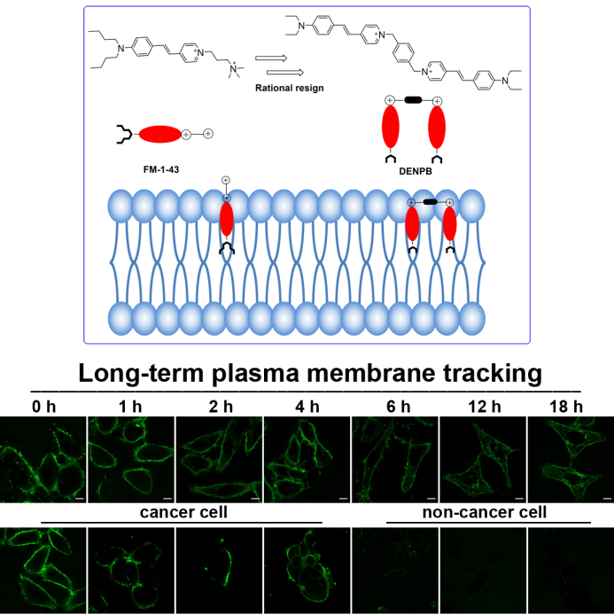 针对质膜探针普遍存在滞留时间短这一问题,项目组基于磷脂双分子层两亲性结构特征,在传统的苯乙烯类质膜荧光探针的基础上,采用两亲性设计策略,并通过对称的分子结构及其整体折叠构型增加探针跨膜的阻力,设计合成了一种两亲性聚集诱导发射(AIE)的远红外荧光探针,将质膜示踪时间由商用或文献报道探针的30 min提高到6 h。该成果以“Cancer cell-selective aggregation-induced emission probe for long-term plasma membrane imaging”为题发表于Cell press期刊《Cell Report Physical Science, 2022, 3, 100735》。全文链接://www.sciencedirect.com/science/article/pii/S2666386421004665