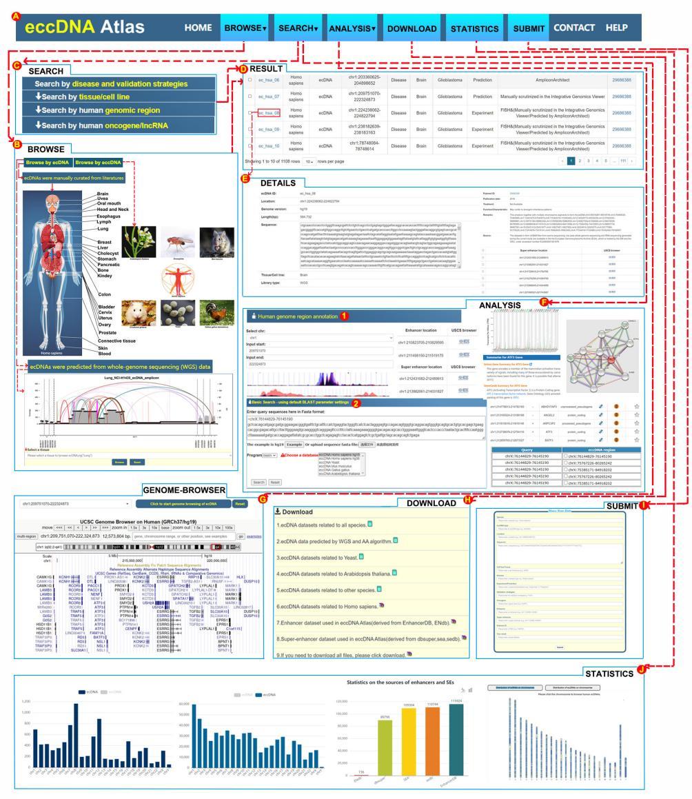 针对这一需求,郭志云老师团队开发了eccDNA Atlas 平台 (//lcbb.aidifilms.net/eccDNAatlas),旨在为浏览、搜索和分析来自多个物种的eccDNA提供高质量整合资源。eccDNA Atlas目前包含629,987个eccDNA和8,221个ecDNA,以及基于WGS识别的1,105个涉及66种疾病、57个组织和319个细胞系的ecDNA。每个eccDNA条目的内容包括物种、位点、疾病、特征、验证策略、功能、序列信息等多个方面。此外,还提供了丰富的注释信息和分析工具来探索eccDNA Atlas中现有的eccDNA或用户定义的eccDNA,包括致癌基因、普通增强子、超级增强子、CTCF结合位点、SNP、染色质可及性峰、eQTLs、基因表达、生存分析、基因组可视化和序列比对等。这一平台的开发将为从事肿瘤医学、分子生物学以及表观遗传学等领域的研究人员提供全面的染色体外DNA研究解决方案。