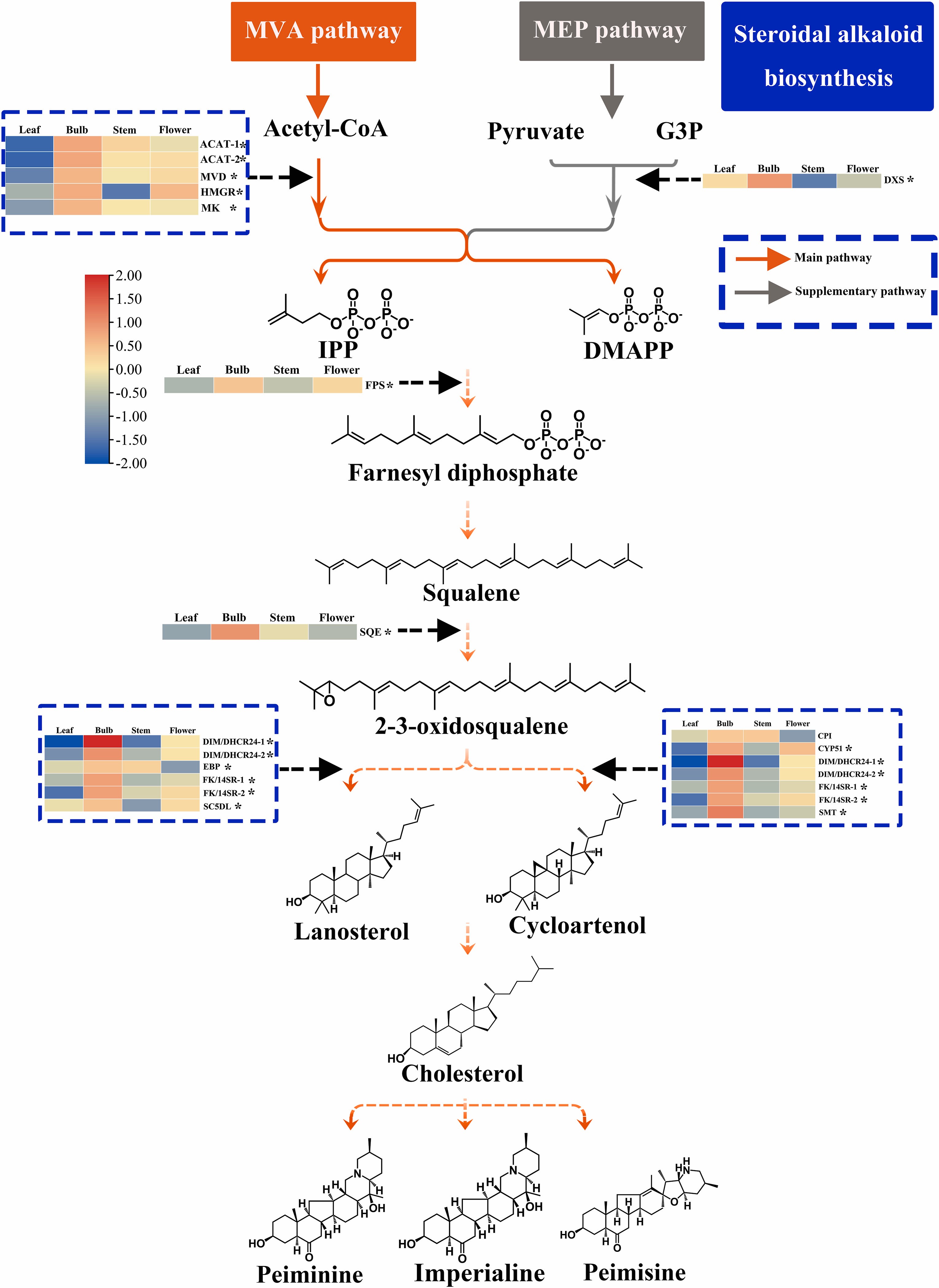 对9217个差异表达的单基因(DEGs)进行GO和KEGG富集分析结果表明,苯丙烷代谢(phenyl- propanoid biosynthesis)、MVA介导的萜类骨架生物合成(terpenoid backbone biosynthesis)和类固醇生物合成(steroid biosynthesis)等过程在鳞茎中富集,而MEP介导的萜类骨架生物合成、光合作用(photosynthesis)、光合作用-天线蛋白(photosynthesis-antenna protein)和类胡萝卜素生物合成(carotenoid biosynthesis)等过程在地上组织(叶、花、茎)中富集。聚类分析表明,与上游萜类骨架生物合成途径相比,下游类固醇生物合成途径在甾体生物碱的生物合成中更为重要。另外,筛选到可能参与甾体生物碱合成、调控与运输的CYP450s、转录因子和ABC转运蛋白。最后,借助蛋白质-蛋白质相互作用分析表明δ(24)-固醇还原酶(delta (24)-sterol reductase)可能是位于核心位置的关键酶。