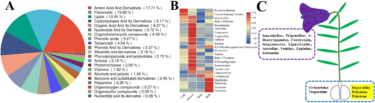 图1 暗紫贝母不同组织的代谢组及生物碱富集