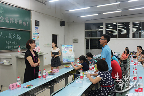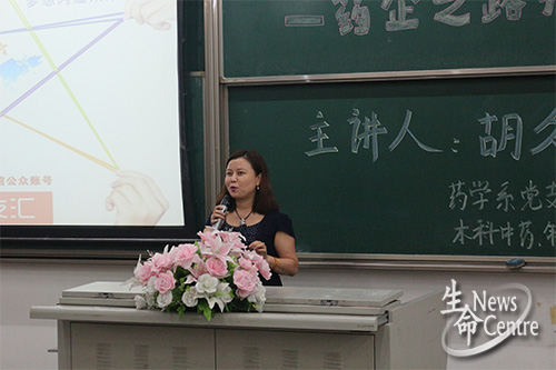 在欣赏完短片后,药学系主任胡久梅为同学们献上了又一份“大礼”。她结合自身从生产技术到药物研究再到药物经营等职位的经历带同学们初步跨入药企的大门。之后,她详细介绍了执业药师的相关考试时间、条件以及准备等,并希望大三同学能于2018年10月,大二同学于2019年10月考取此证书。她强调只要努力,便一定没有问题。接着,胡久梅老师针对最近肆虐西非的“埃博拉”病毒为主题,向同学传达了作为制药人应该不害怕、不逃避,做好药学的精神。最后,她给同学们分享了自己喜爱的诗歌并同全体同学一起朗读。