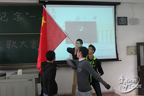 首先上场是生工五班的同学,他们饱含深情地唱了一首《歌唱祖国》,歌声中充满了他们对祖国深深的爱意及作为一名中国人的自豪感;接下来表演的是制药一班的同学,演唱的曲目也是《歌唱祖国》,他们别出心裁,先由中间的两名同学朗诵了一首赞美祖国的诗歌,继而开唱,嘹亮而动听的歌声萦绕全场,洗礼了每一个人的心灵;最后出场的是制药二班的同学,他们将歌曲与节目有机的结合在一起,先由一名同学出场挥舞着五星红旗,再由周围四名同学互相配合做出不同的手势等身体动作,通过简单的革命岁月情景再现来表达对祖国的热爱以及对国旗的赞美之情,另外两名同学则在一旁进行诗词朗诵,之后,在指挥有条不紊的引导下,配之以振奋人心的伴奏音乐,一首耳熟能详的红色歌曲完美地展现在众人面前。