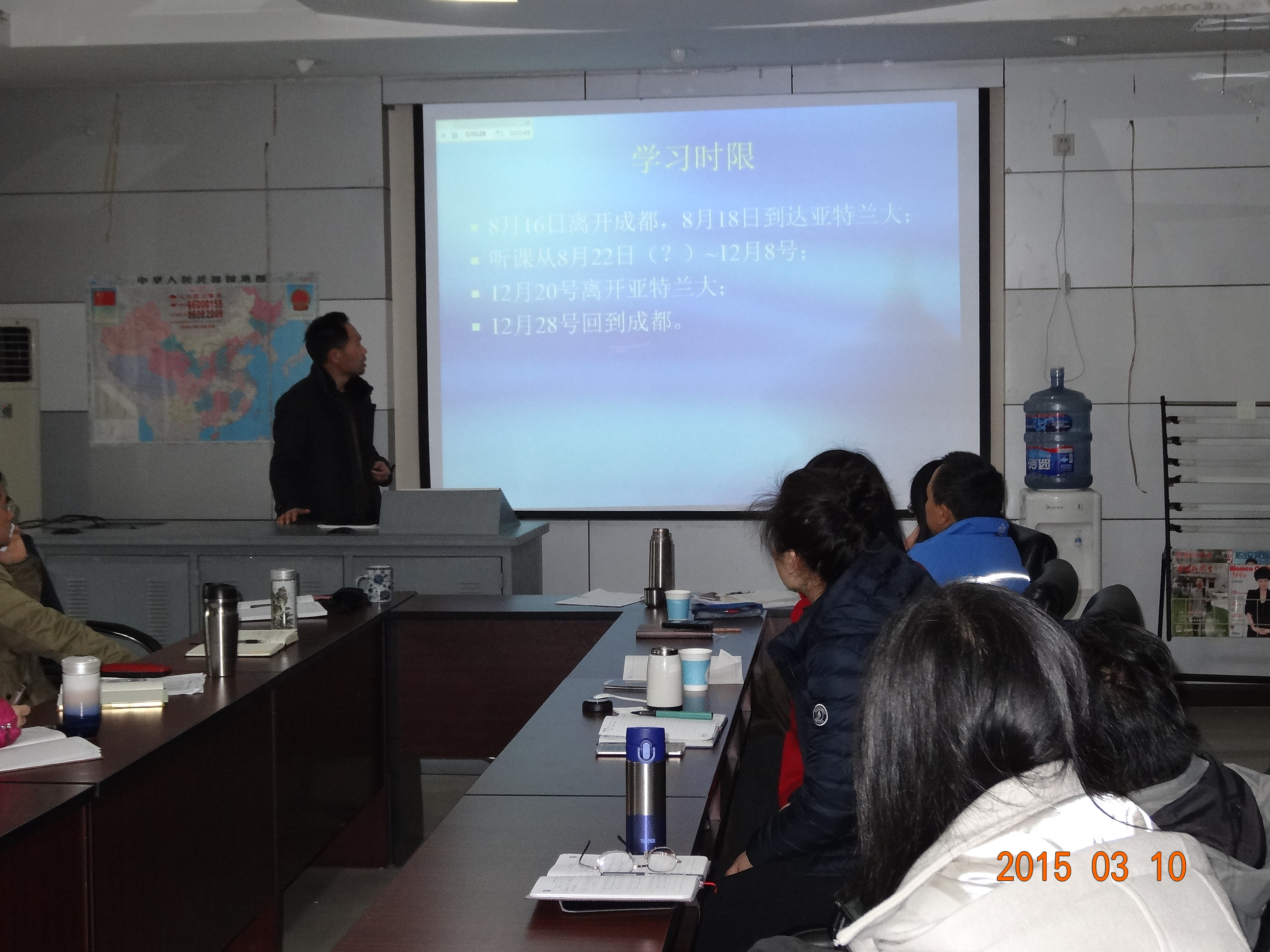 2014年学院出国学习归国的闫智勇、万军、王万军、廖海、郭泰林、刘新荣6位老师分别就自己在国外的专业课程学习、英语能力学习、科研学习等方面的收获与心得依次做了专题汇报,6位老师会前都做了精心准备,会上使用PPT图文并茂的交流了自己的研修或访学情况、收获与体会。并表示出国学习开阔了视野、启迪了思维,在教学和科研中也收获了一些经验,这些经验将结合工作实际运用到今后的教学科研工作中。