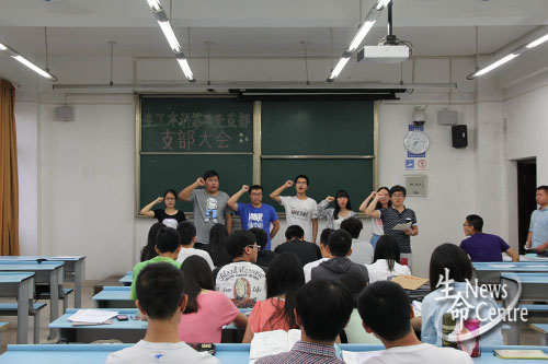 19:50,主持人统计并宣布无记名投票结果,五名转正的预备党员以及六名发展入党的积极分子都全票通过。6名新入党同志站上讲台,并在赵浩淼同志的带领下庄严宣誓,坚定的誓词中流露出每位同志对党的崇敬与信任之情,伴随着铿锵有力的誓言,会场充满了鼓舞人心的力量。