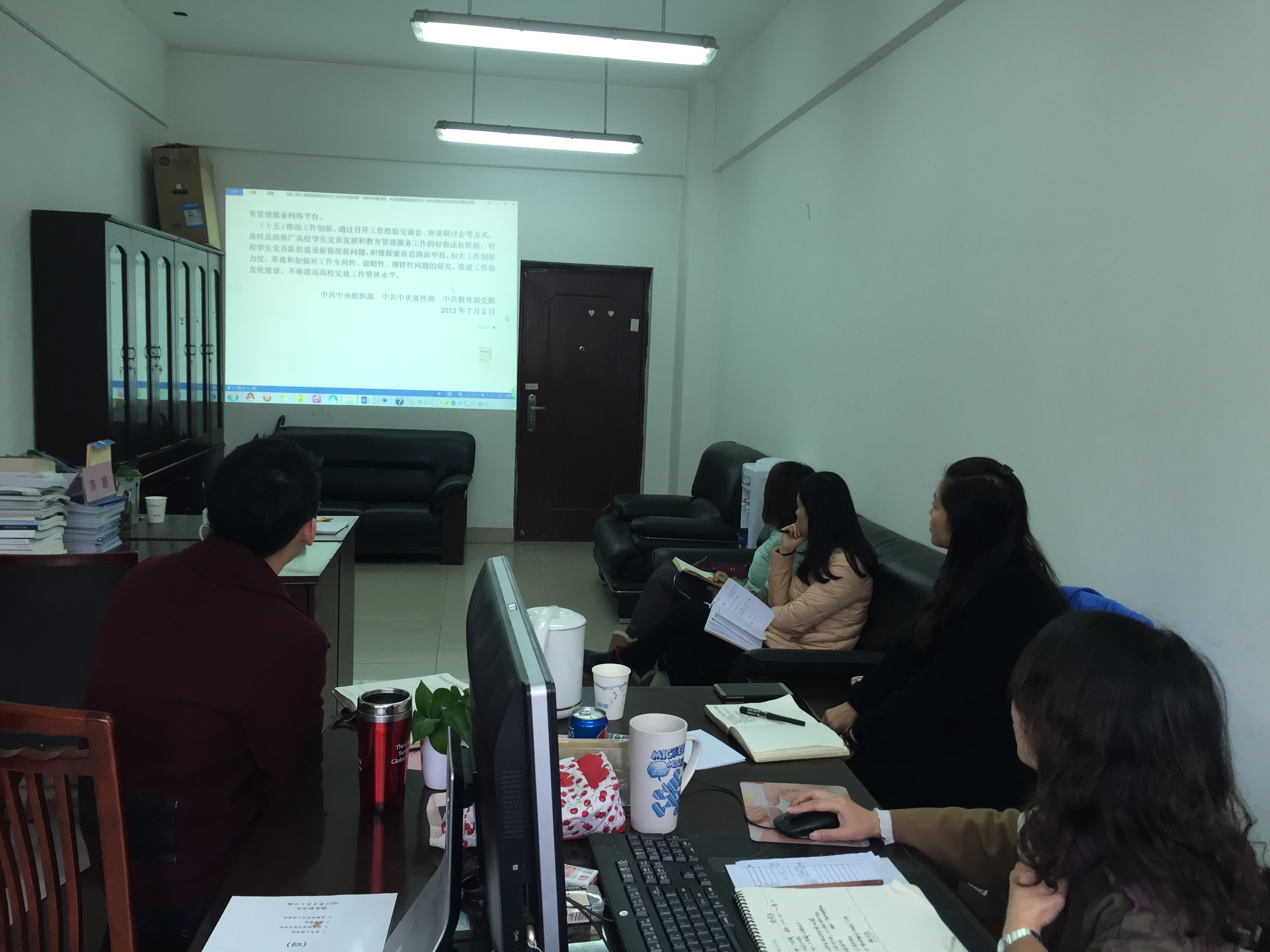 会议第一阶段,孔琳老师就《中共中央国务院关于进一步加强和改进大学生思想政治教育的意见》和《关于进一步加强和改进新形势下高校宣传思想工作的意见》文件内容进行了详细的解读,带领全体学工组成员学习文件的内容及精神,并进行了讨论。