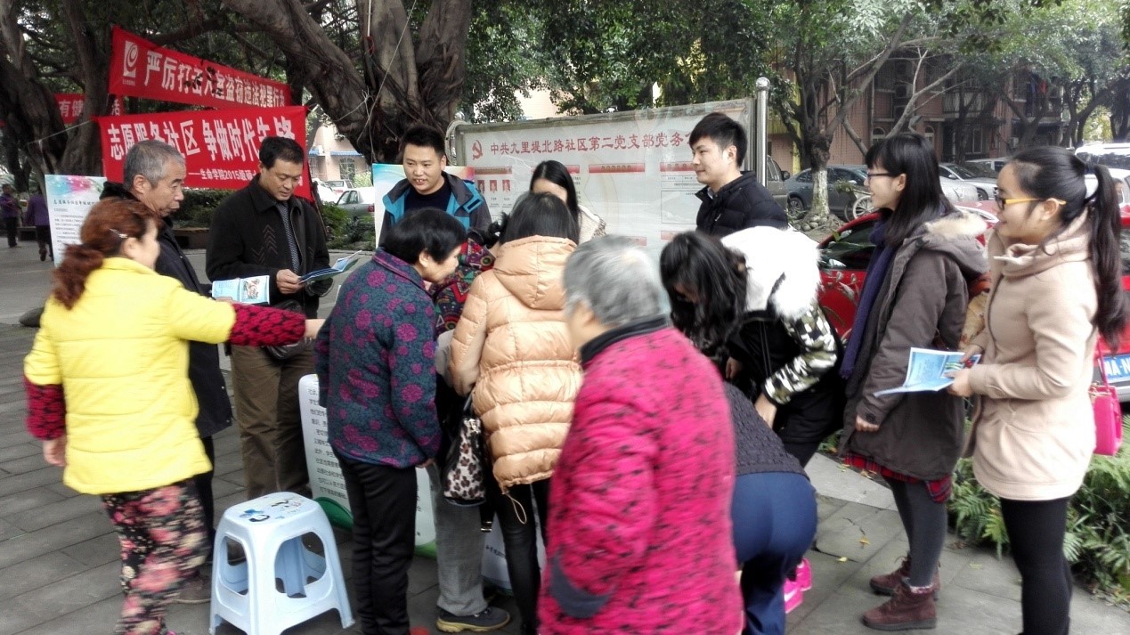 上午9:00活动正式开始。首先由党支部书记李祯介绍本次活动的主题与目的,对活动内容进行了简单的任务安排和分工,党员志愿之们随即投入到活动中去。活动的第一个环节是学生党员向小区居民讲解医疗、应急和保健方面的知识。主要强调了“急救包”是每个家庭都应该准备的,最好将其放在平时活动最多的地方,急救包里面放置一些应急医疗卫生用品(如:绷带、碘伏棉棒、创可贴、医用胶带、急救手册等等)是很重要的,同时列举了一些可能发生的意外(如:烫伤、切伤等)以及如何应对这些情况。讲解过程中不时有居民进行提问,党员们耐心作答,最后还进行了有奖问答活动,对积极参与活动的居民给与了小礼品。