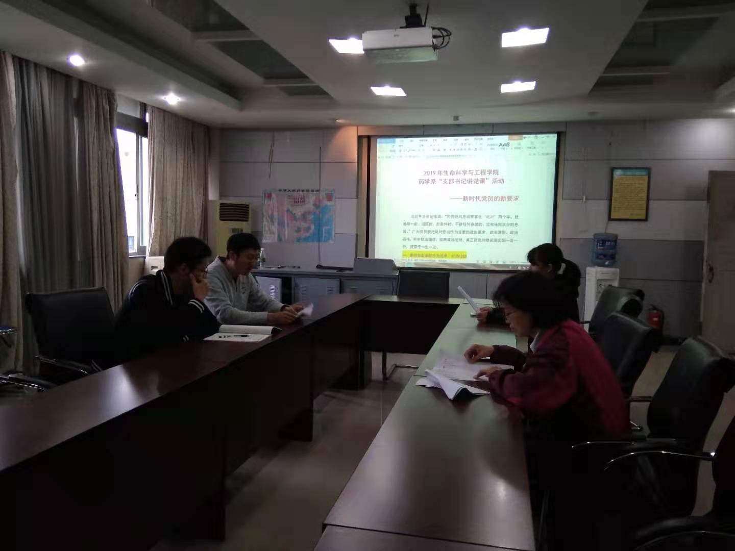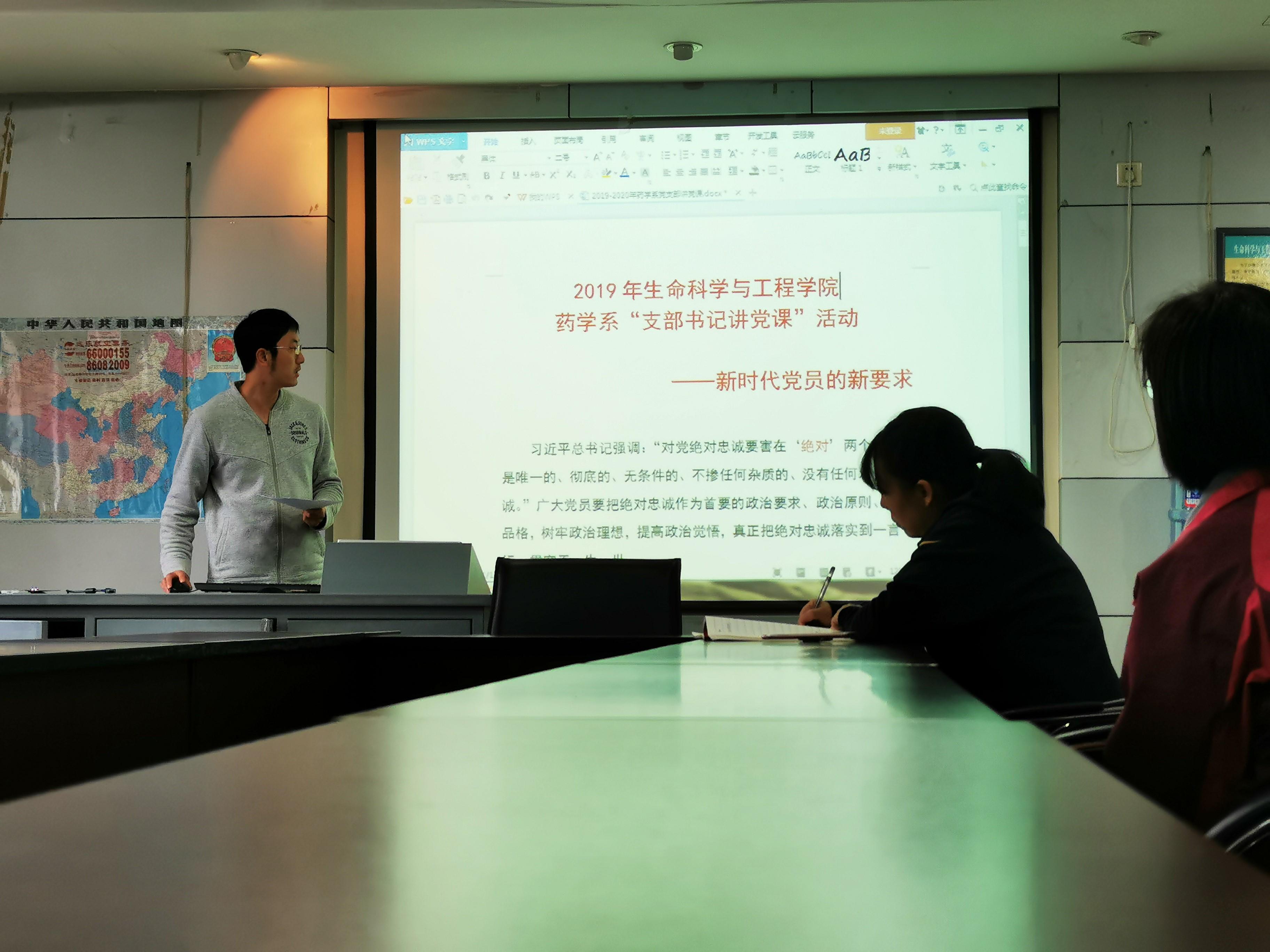 2019年10月24日,下午3:00,药学系教工党支部在“不忘初心、牢记使命”主题教育中,党支部书记万军为党员开展讲党课活动,并结合学院实际情况,以“绝对忠诚”为主题,从敬业奉献、为民服务、气正风清等三个方面进行了详细阐述,并与大家一起学习讨论。