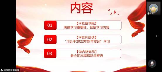 硕士研究生生物与医药党支部在线上开展了2022年第1次党员大会。会议由党支部副书记韩琼主持。参加人员为党支部党员、发展对象、积极分子以及入党申请人等60余人。