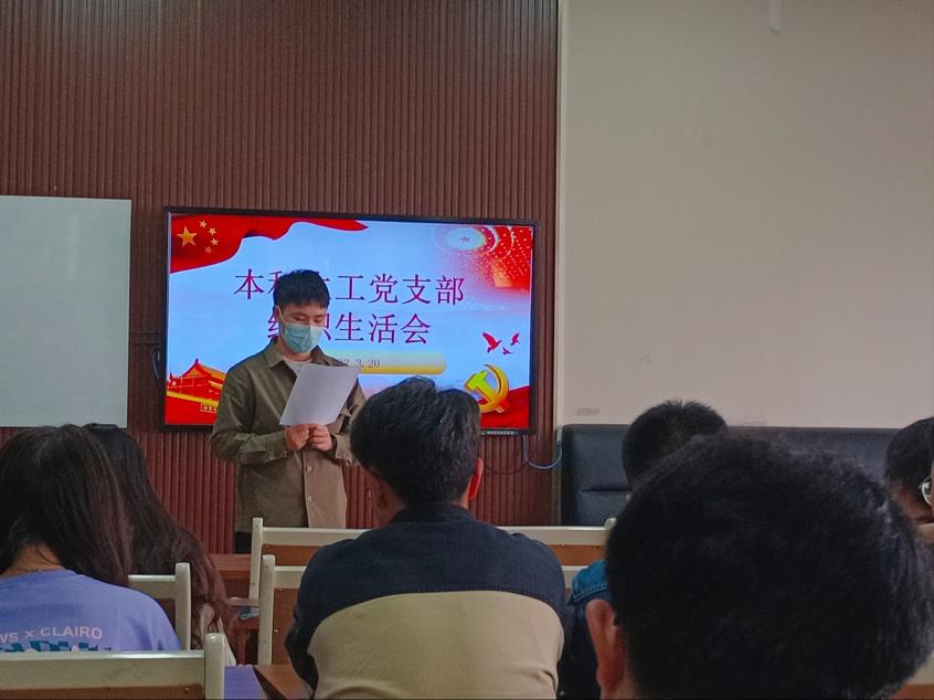 会议第一项为本科生物工程党支部述职,由曲振同志代为进行述职报告,主要就党支部的组织建设和育人建设两个方面展开叙述,详细介绍了党支部2021年度的基本情况,总结各项工作,提出不足与展望。