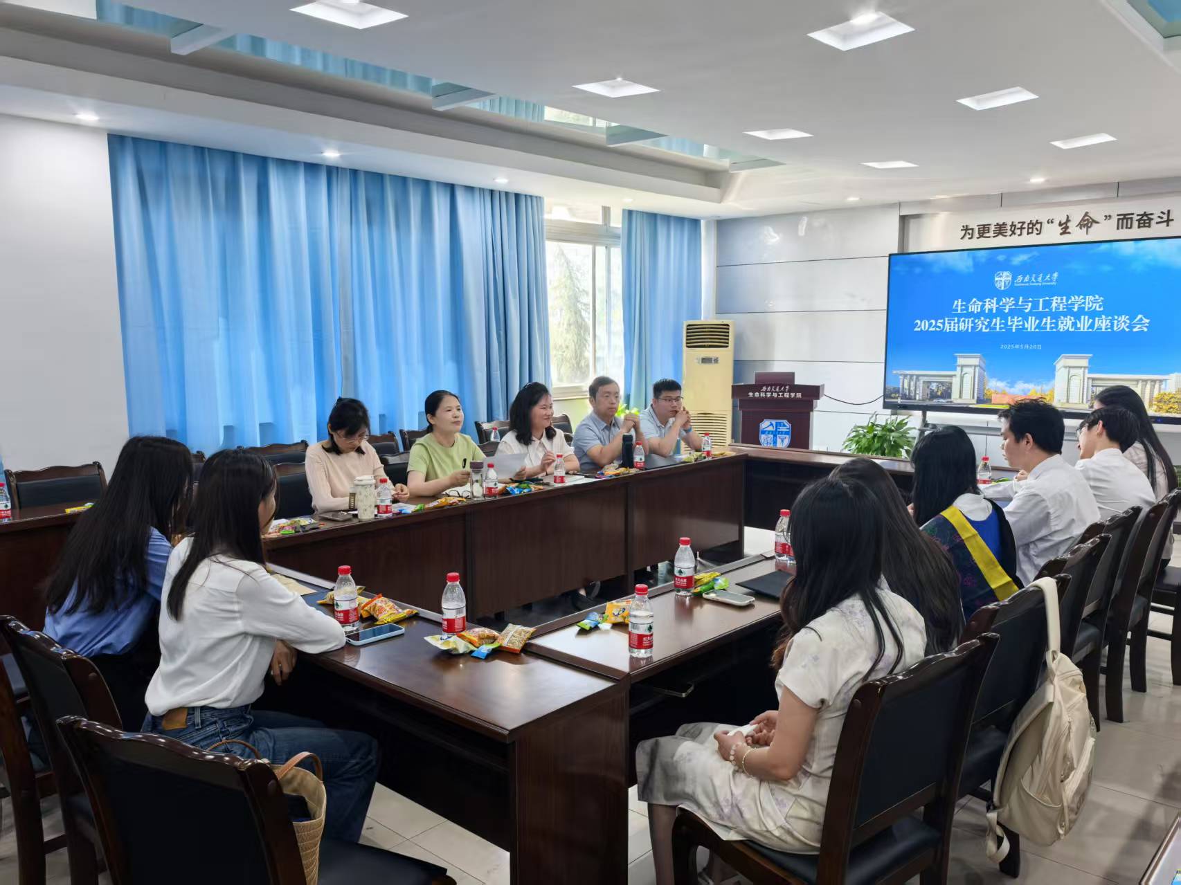 在九里校区组织召开2025届研究生毕业生就业座谈会。学院党委书记黄春蓉、副院长陈琳、党委副书记高鹏、团委书记杨颖增及研究生导师代表与毕业生代表进行了深入交流。