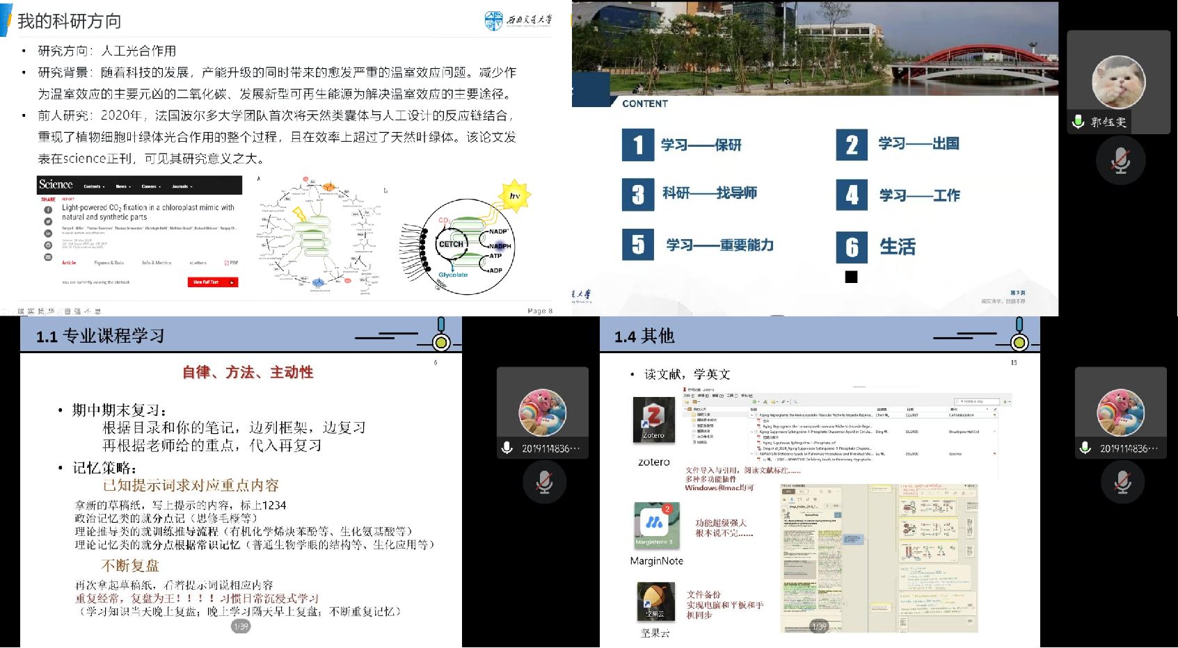 在“科研经历分享”环节中,来自19级生命科学拔尖班的王冠雄、洪美莹、郭钰雯以及制药工程专业的辛锦秀、生物工程专业的周河汐五位学长学姐为同学们进行了相关经验的分享。五位学长学姐现均已推免至国内一流高校攻读硕士学位。他们准备充分,从学习、生活、科研等几个层次给心存疑惑的学弟学妹们详细而有针对性地分享了自己在大学里领悟的处理经验。分享内容既有专业课、公共课的高分攻略,又有竞赛组队指南,还有保研、寻找导师的心得体会。