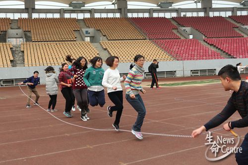经过运球接力项目的热身,女教职工们逐渐进入了状态。接下来的跳绳运动恰好给教师们展现良好身体素质和默契程度的机会。经过简单的磨合,控绳队员与跳绳队员发挥良好。由于是大型团体体育运动,跳绳比起其他项目要求的队员配合程度更高,爱迪影视