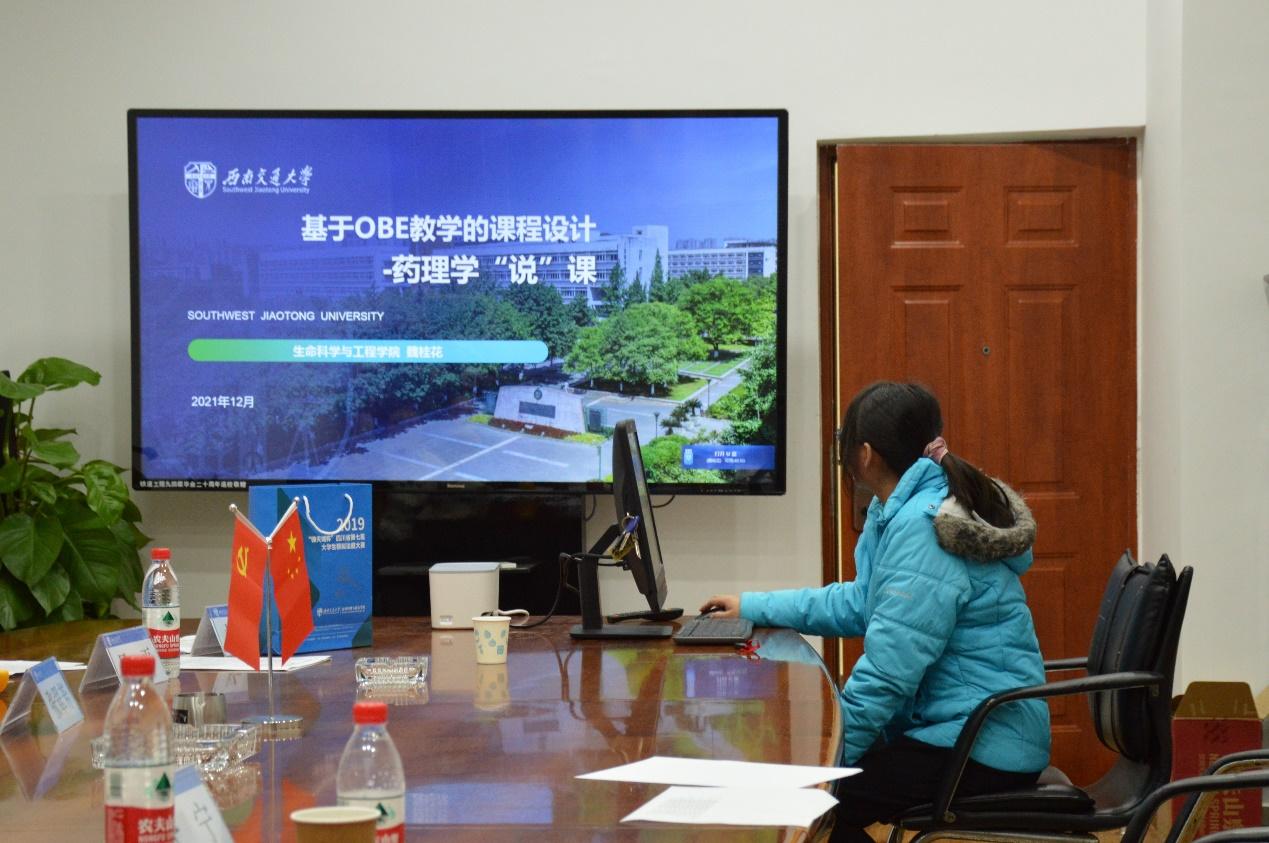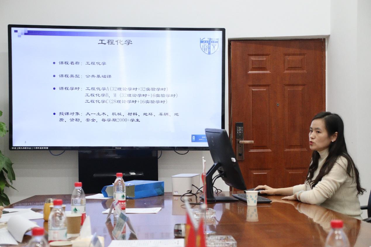 《物理化学B》的建设成果由郝静老师答辩展示。她着重展示了本课程在线上教学上的成果,向专家们展示了创新的线上教学互动流程。她提到“要将教书交给机器,老师则负责育人”。