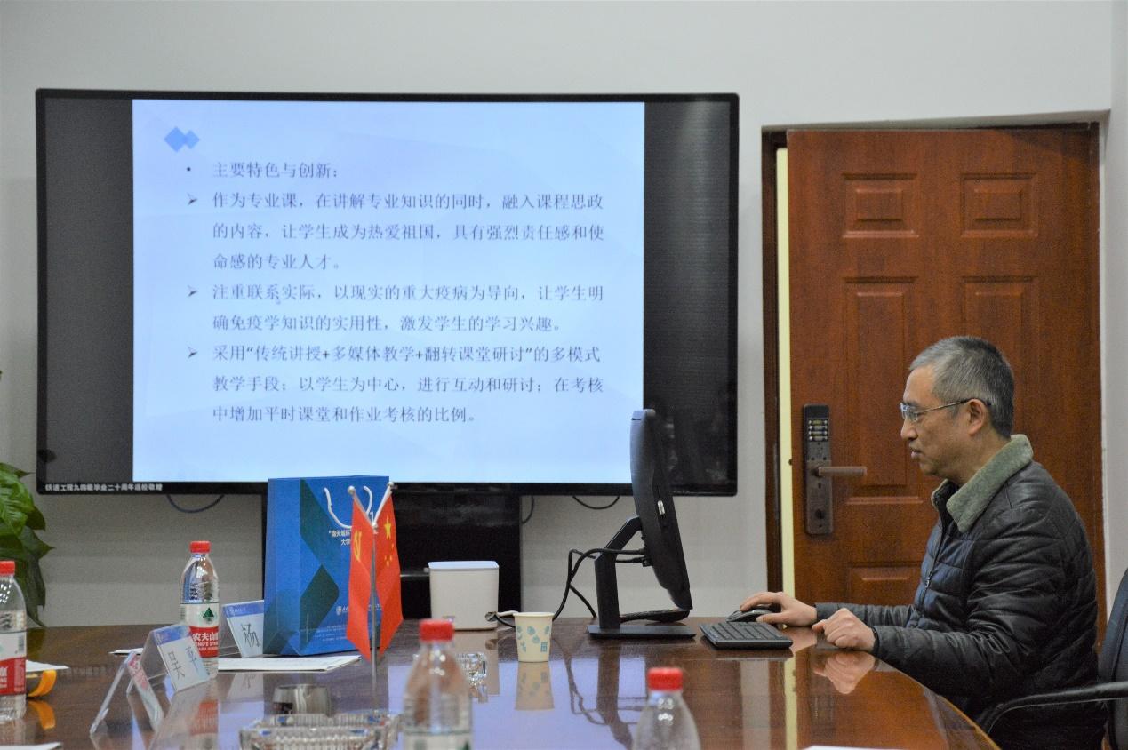 喻凯老师汇报了《免疫学》的建设情况。该课程在讲解知识同时,融入课程思政的内容,并将实施过程和心得整理成文发表在《教育教学论坛》。在课堂讲授时联系实际,注重知识实践性,同时采用“传统讲授+多媒体教学+翻转课堂研讨”的多模式教学,获得在场评委的一致认可。