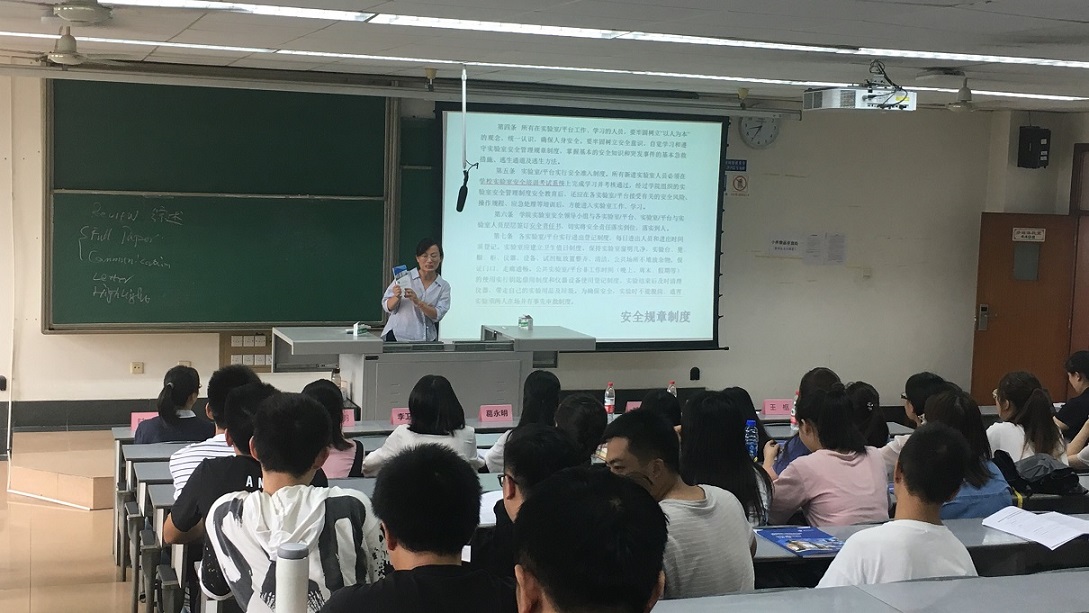 随后,学院实验中心对同学们进行实验室安全知识教育。实验中心主任张纯姑老师为同学们介绍了学院实验室管理的相关政策和制度,让新生们在开学第一课就深刻意识到实验室安全的重要性。实验中心副主任任瑶瑶老师结合多起其他高校实验室事故案例为同学们讲解了实验室常见的安全隐患和实验注意事项。实验中心江南屏老师则特别向同学们介绍了学院编写的《实验室安全手册》,希望同学们下来认真学习,并严格遵守实验室秩序。