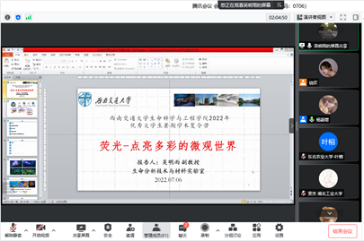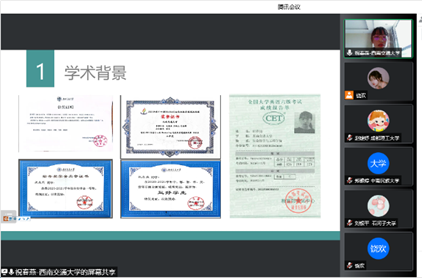 7月7日下午14:30,谭睿老师、王璨老师、王萃娟老师等13名老师与65名同学汇聚于腾讯会议,开展了既严肃紧张又生动活泼的师生交流。在此环节,老师们向来自全国各地的学子详细介绍了自己的研究领域、研究成果、团队成员及未来的研究方向,并对各位优秀学子的报考表达了真挚的欢迎。在老师介绍结束后,同学们接二连三的就自己感兴趣的研究方向进行提问,与各位老师深入交流,表现出了浓烈的学术兴趣。