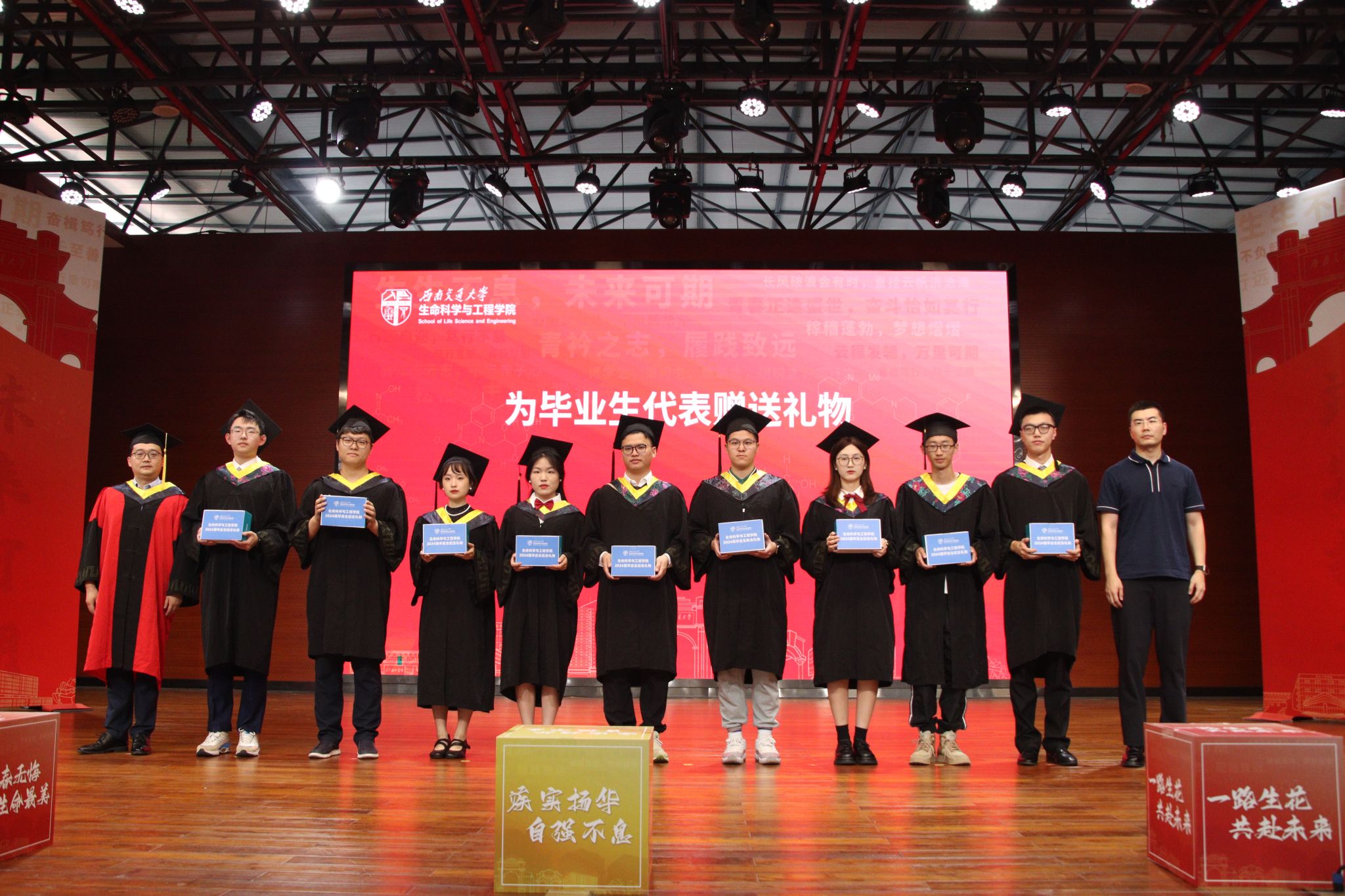 为2024年毕业生也精心准备了一份“时钟夜灯无线充电台”毕业礼物,学院毕业礼物由杜隆飞校友联系科伦药业赞助支持。这份礼物不仅代表着校友、企业对学弟学妹的关心,更寓意着对大家未来职业生涯的无限期望和祝福。杜隆飞校友、高峰副院长为毕业生代表发放毕业礼物,愿这份礼物陪伴毕业生们开启新的人生篇章。饮水思源,不忘初心。学院2024届毕业生也为学院精心准备了一份由全体毕业生照片组成的“青春无悔,生命最美”礼物,以表达他们对学院的感激之情和美好祝愿。周先礼院长、黄春蓉书记代表学院接受毕业生向学院赠送的礼物。