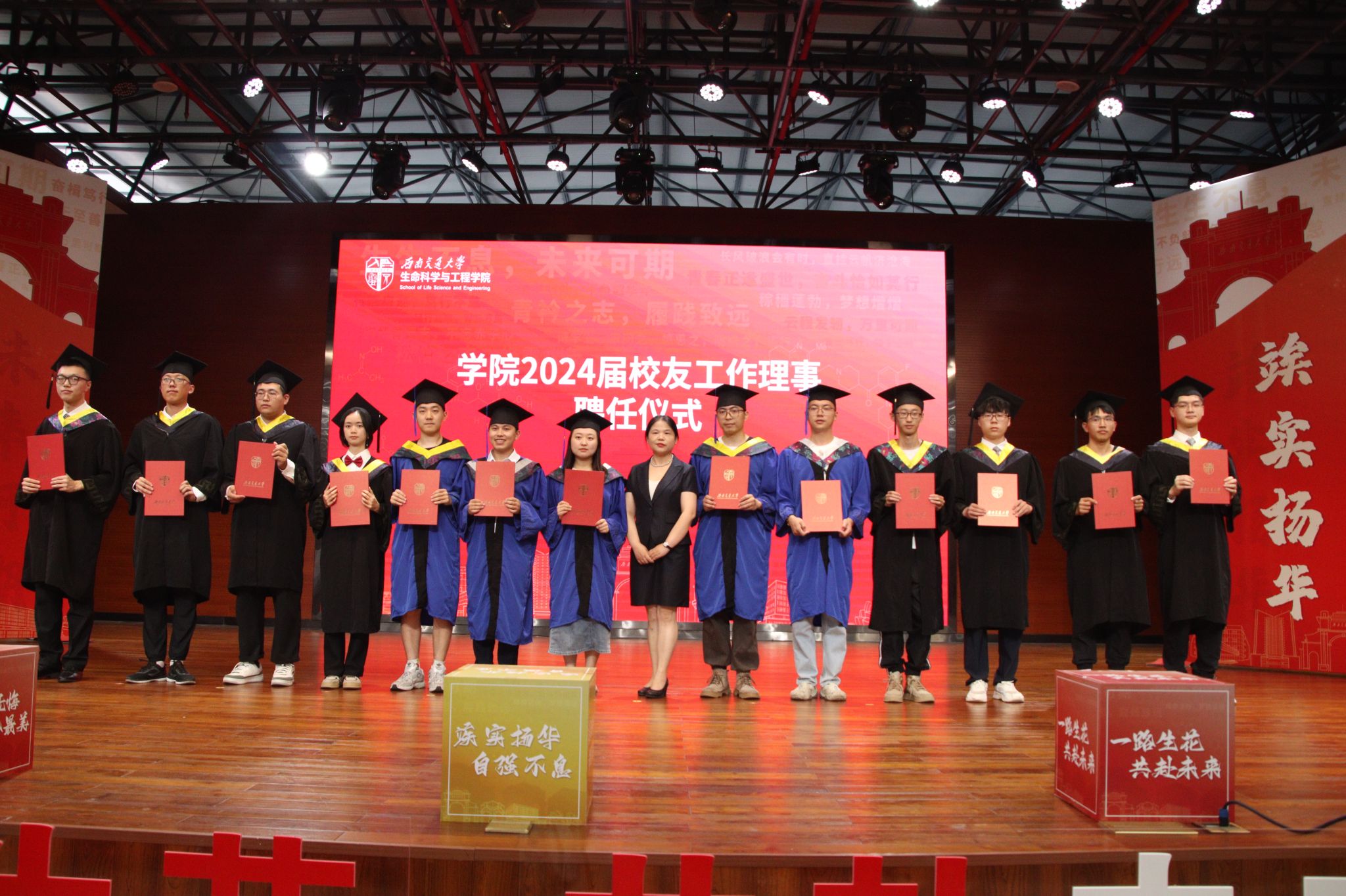 2024届优秀毕业生中设立年级理事、班级理事。学院党委书记黄春蓉老师宣读2024届校友工作理事名单,并颁发证书。她表示,校友是学校最亮丽的名片、最牢固的基石,也是最宝贵的资源,希望理事们能认真履行职责,扮演好桥梁纽带的角色,成为母校与校友间的信使,带动广大校友常回母校观新貌,常见师友话家常。