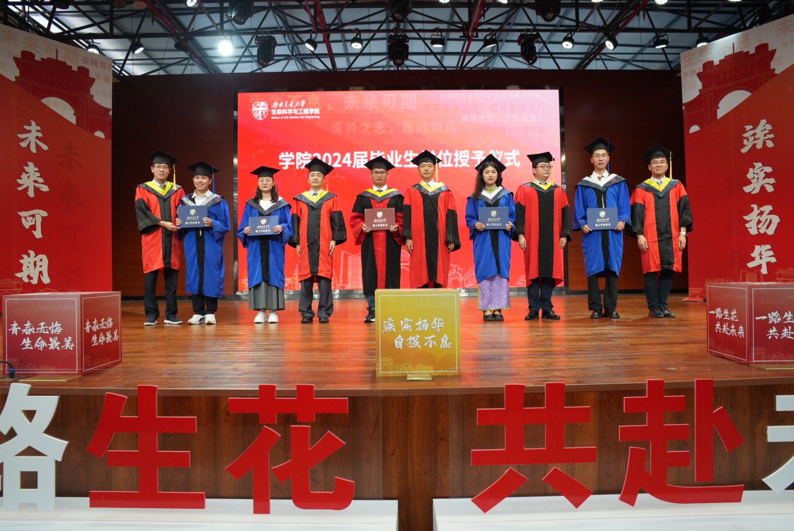 在典礼上,周先礼院长代表学院致辞,他鼓励生命学子踏实向前、执着向上,并为即将追梦远航的毕业生们提出几点希望:一是希望大家心怀“国之大者”,用大情怀拥抱大时代。二是希望大家牢记“德之厚者”,用大格局涵养大智慧。三是希望大家坚持“行之实者”,用大作为赢得大发展。希望毕业生们带着在交大学得的一身本领,主动担当作为,瞄准国家和人民的需求,在生命科学和生物技术等领域勇挑重担,积极投身到全面建设社会主义现代化国家新征程的伟大实践中,做新时代的奋进者、开拓者、奉献者。