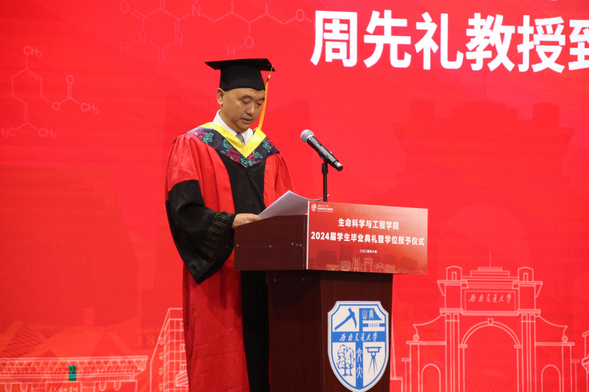 2024届学生毕业典礼暨学位授予仪式在犀浦校区隆重举行。学院院长、学位分委会主席周先礼,学院党委书记黄春蓉,学院副院长、学位分委会副主席高峰,学院党委副书记朱炜,学院2017届本科毕业生、科伦药业江西省区总经理杜隆飞校友,院学位分委会委员,学院生物工程系、药学系、实验中心、综合事务办公室、学生支持办公室、学生工作组、团委等单位负责人、辅导员、教师代表、校友代表以及全体在校毕业生及学生家长共计300余人参加典礼。典礼由2024届本科毕业生辅导员高鹏主持。