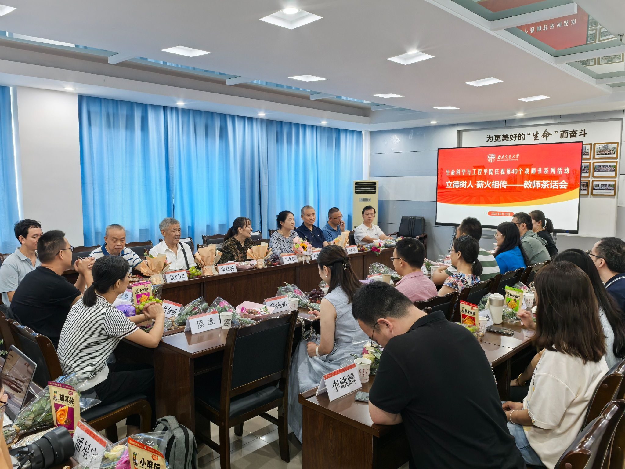 在J3609会议室举办“立德树人·薪火相传”教师节茶话会活动。学院党委书记黄春蓉、退休教师代表、中青年教师代表、辅导员和教辅人员参加了本次活动。活动由党委书记黄春蓉主持。