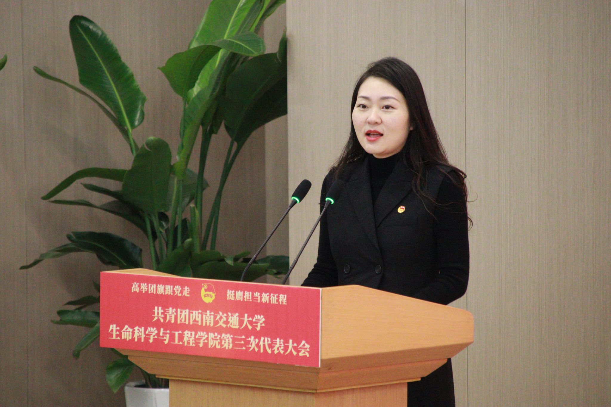 党委书记黄春蓉代表学院党委向大会的召开表示热烈的祝贺,向一直以来关心和支持学院共青团工作的各位领导、老师以及各位青年朋友们表示衷心的感谢,向参会的各位代表致以亲切的问候与美好的祝愿。她对学院共青团各项工作给予了高度肯定并指出,站在新的起点上,学院共青团要强化使命担当,切实增强引领力、组织力、服务力,着力推动各项工作高质量发展。一是坚持旗帜引领,用习近平新时代中国特色社会主义思想凝心铸魂。二是要坚持从严治团,统筹推进学院共青团改革向纵深发展。三是要密切联系青年,关注青年所思所想,解决青年所急所盼。她勉励广大团员和青年,要立志做有理想、敢担当、能吃苦、肯奋斗的新时代好青年,在强国建设、民族复兴的伟大征程上书写属于生命青年的青春华章。