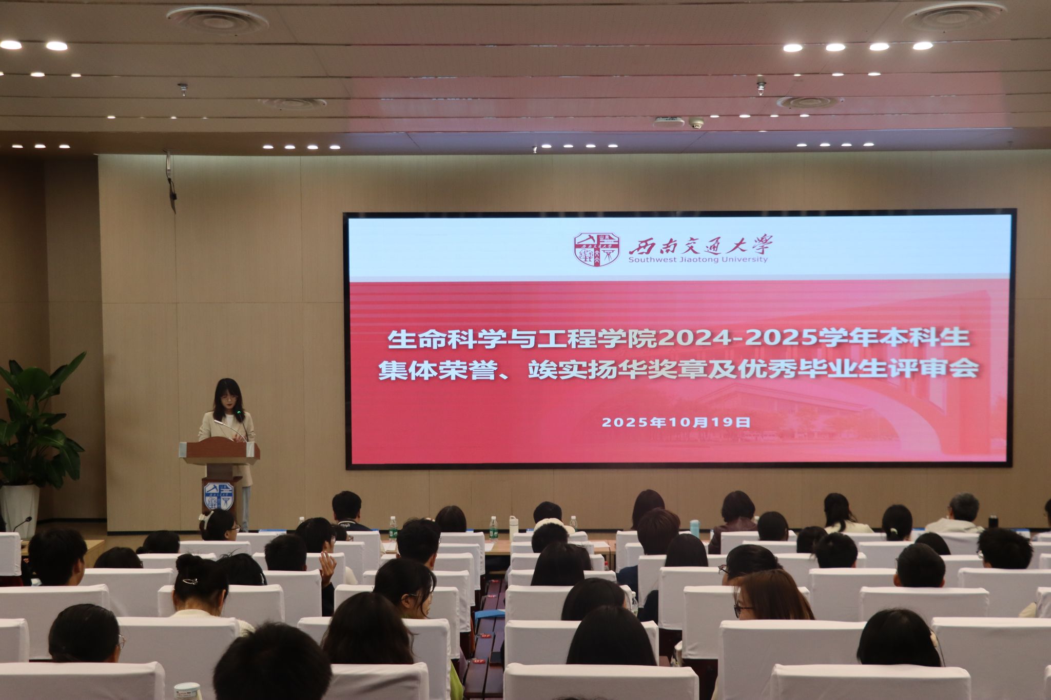 于2025年10月19日下午在图书馆二号报告厅顺利举办了2024-2025学年本科生集体荣誉、竢实扬华奖章及优秀毕业生评审会。学院党委书记黄春蓉、党委副书记高鹏、副院长陈琳、中外合作办学项目主管黄新河、生物系副主任朱乾坤、实验中心主任刘新荣、班导师代表孙会丽以及本科生辅导员出席会议并担任评委,各班学生代表参会观摩。