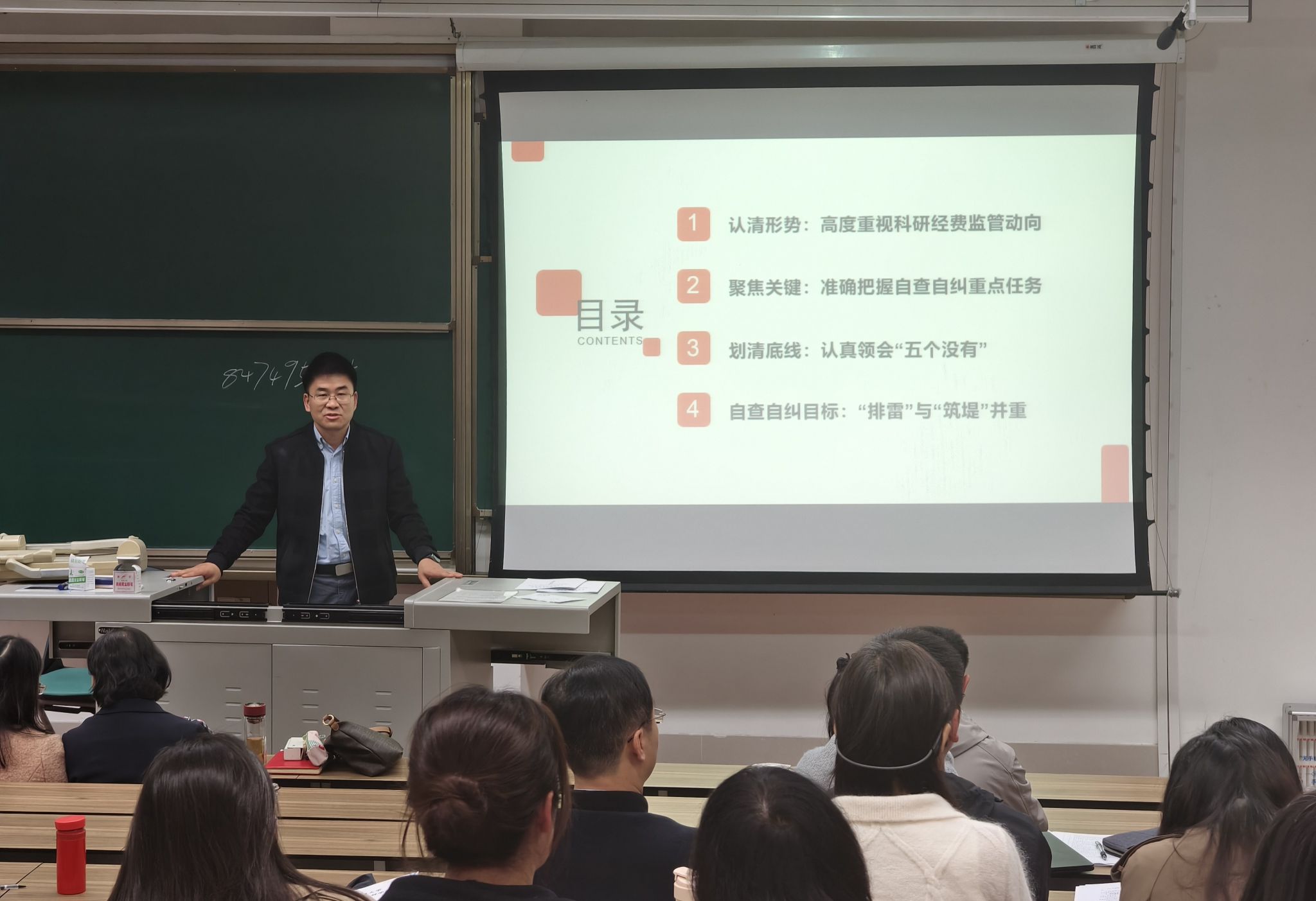 会议的第三个议程是对2025版学院绩效工资分配方案修订的介绍和说明。王毅副院长详细介绍了学院二级管理岗位设置及绩效工资分配实施方案的修订背景与核心原则,对关键调整部分进行一一解读,强调新方案旨在强化“优劳优酬”导向,以更好地激励教职工,推动学科建设、科学研究与人才培养等核心工作的发展。随后,王毅通报了科研经费使用自查工作的总体安排。