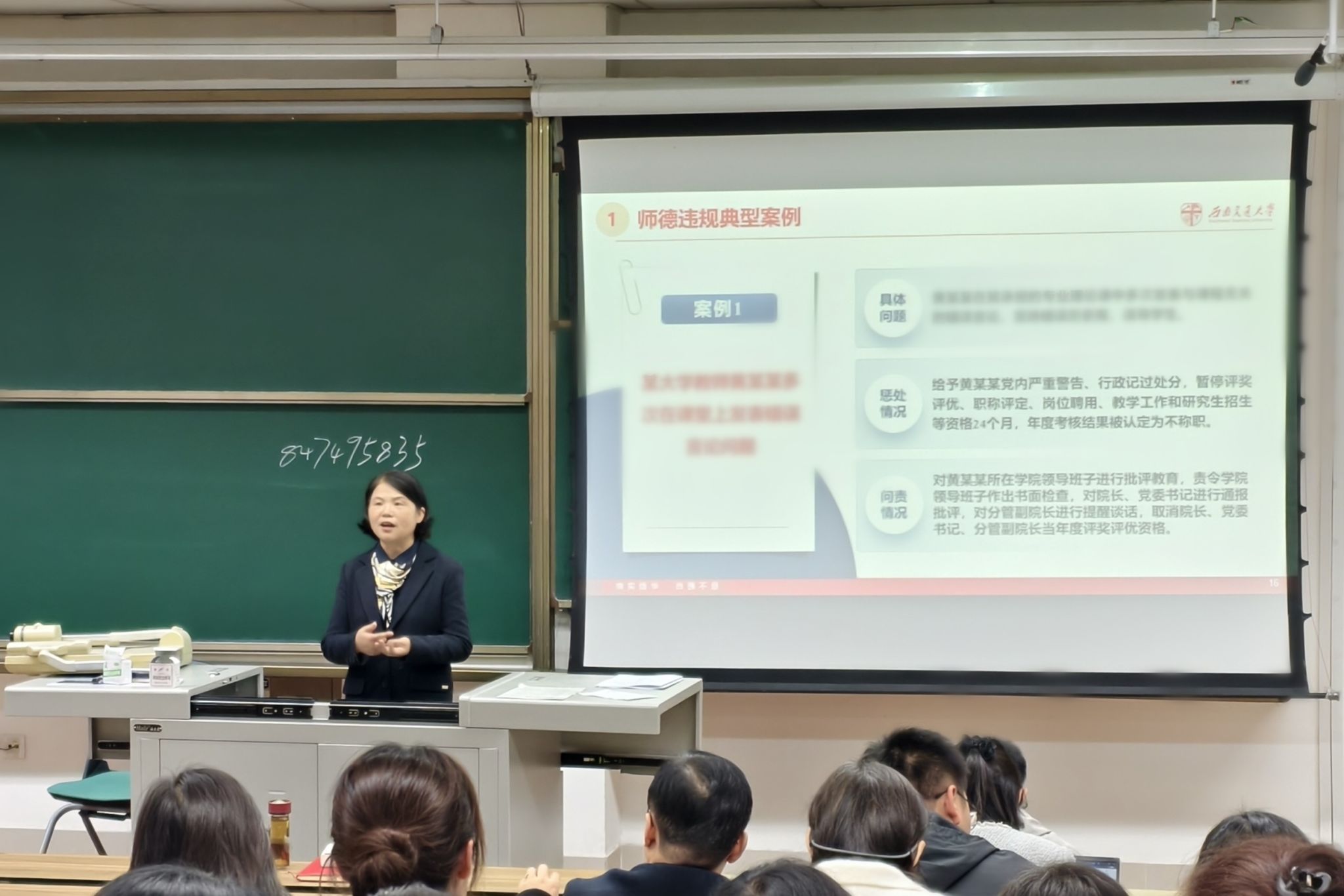 会议的第二个议程是师德师风专题教育,黄春蓉以“恪守十项准则,涵养高尚师德”为主题宣讲。她介绍了近年来党中央和教育部颁布的师德师风相关制度和规定,并带领全院教师再次重温了“新时代高校教师职业行为十项准则”的相关条款和内容,同时结合教育部公开曝光的典型案例,深入剖析了近年来高校出现的师德师风失范行为及其严重后果,为全体教职工敲响了警钟。她要求全体教职工从案例中汲取教训,反躬自省,牢固树立“师德为先”的理念,筑牢思想防线,争做学生为学、为事、为人的“大先生”。