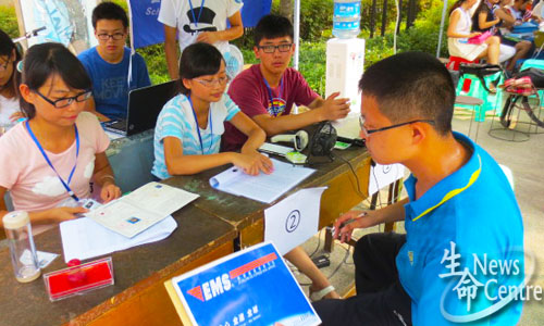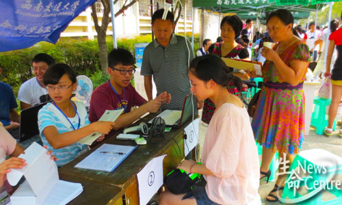 标志的环保袋及“蓝色神秘礼包”——其中包含的不仅仅是新生手册、一封来自学长的信,更是浓浓的交大情、生命情!随后指导她填写学籍表、讲解相关学费缓交流程、为其拍照留影,最后,接待小组帮忙提行李直至寝室楼。随后,更多新生陆陆续续来到迎新点,志愿者没有一丝怨言,协同合作将迎新工作进行到底!