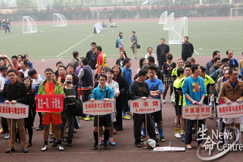 第二届教职工足球赛开幕式于北区足球场正式开始。参加开幕式的嘉宾有党委副书记何云庵教授,党委办公室甘灵主任,校工会罗乾超主席,体育部主任刘旭教授,校工会郑江副主席,教职工足球协会车伟会长,裁判长田进,各代表队队员及裁判员们。
