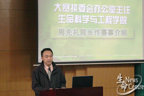 周先礼院长对赛事作简要介绍,他提到此次大赛一共收到92组报名作品,其中87组为有效作品,经多个学校共9位评委,本着公平公正的盲审模式,通过为期10天的初审及打分选出此次进入决赛的队伍。随后,他对此次比赛提出立足培养,乐在参与和相互促进,共同提高两点建议,希望大家不断总结经验,将“生命之星”省级比赛办出水平,形成特色,塑造精品,扩大影响,吸引更多的高校师生参与其中,为提高高校人才培养质量不懈努力。