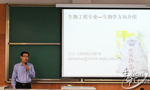 接着,廖海老师对生物学专业进行介绍。他陈述了生物学的重要性、专业的培养模式、课程设置和就业方向等内容。
