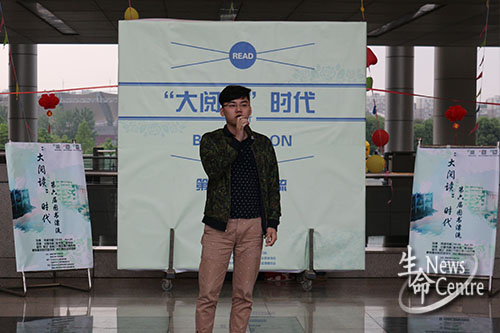 团委副书记魏源成上场致辞。他首先倡导更多同学参与阅读,享受阅读这场旅行。接着,他认为图书漂流以一种更新颖的方式让书籍更好地传播,使知识传递。最后他希望这个活动能够持续举办下去并祝愿活动越办越好。