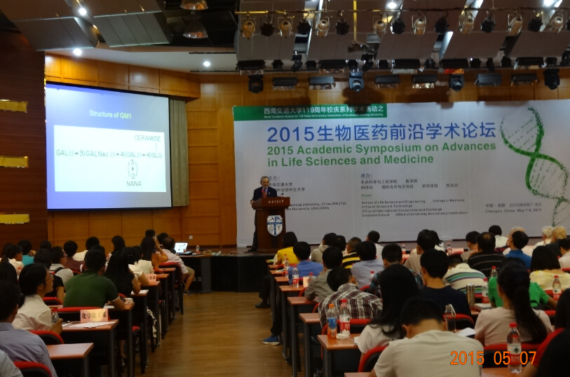 、医学院、科技处、国际合作与交流处、研究生院、校庆办共同承办的2015生物医药前沿学术论坛上,台湾中央科学院院士、美国乔治亚董事会大学教授Robert K.Yu做了题为“外周神经病变的自身免疫机理:抗糖脂抗体在Gullain-Barre综合症中作用”(Autoimmune mechanisms of peripheral neuropathies: Role of anti-glycolipid antibodies in Guillain-Barré )的精彩报告。