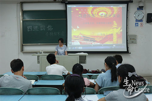 2014级生物工程二班“四进四信”专题分享会于X2334准时召开。本次会议应到28人,实到16人。生工二班团支书郭诗琪担任主讲人。
