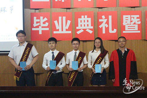 2015届毕业生表彰决定》,由喻凯、李遂焰、陆群三位老师为获得荣誉的优秀集体与个人代表进行表彰、颁奖;紧接着,周院长为毕业生赠送毕业纪念品,小小的纪念品蕴含的是老师们对于毕业生们的殷切希冀。