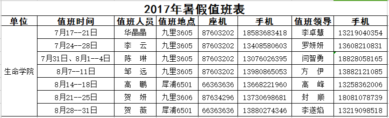 2017年暑假值班表