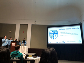 生物工程(中外合作办学)专业2016级秦思嘉、2017级郭泽熙、黄玉洁 兰佳怡、刘馨怡、王泽世、路依林7名同学及乔治亚州立大学10名同学,其中秦思嘉同学和郭泽熙同学登台做了陈述报告。我校队员自2018年底开始,即参加本校组织的iGEM选拔及集训,本着严谨求真的科学精神,不辞辛苦开展实验、分析实验数据,最终凭借扎实的实验操作能力与科研思维入选联合团队。