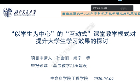 课程思政和学生工作相融合为主题,与参会老师共同探讨了“三全育人”综合改革及思想政治教育体系方面的见解。此外,单连海的大学生SRTP与毕业论文如何衔接过渡;孙会丽老师的“以学生为中心”的“互动式”课堂教学模式对学生学习效果有何影响;万军的制药工程类《新生研讨课》情景教学模式等课题,立足于教学实践,视角新颖,可圈可点。