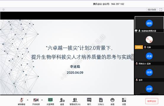李遂焰、李萍、周嘉裕、廖海、黄新河几位老师探讨了在“六卓越一拔尖”计划2.0背景下,如何提升生物学科拔尖人才培养质量的相关问题。周嘉裕以《分子生物学》模块化教学的改革为切入点,力争克服该课程重点难点繁杂、知识点更新迭代太快给教学带来的困难。廖海从产学研协同创新的角度阐述了生物学科拔尖创新人才培养的机制。黄新河结合学院国际化工作,谈到了如何让拔尖人才在国际舞台上发光发亮。李萍老师则发表了关于生物学科拔尖人才培养模式的看法。